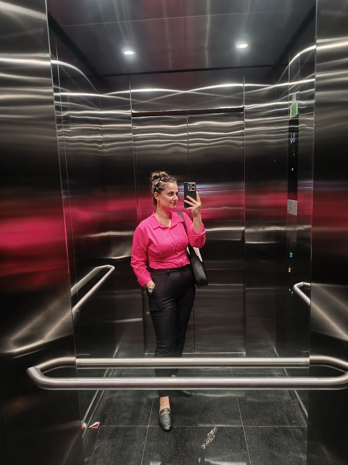Parlak pembe renkte, uzun kollu ve yüksek yakalı, vücuda oturan kadın ofis gömleği. Cesur ve şık bir görünüm sunar. ✨