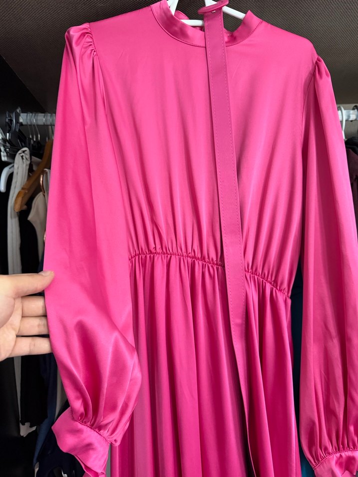Parlak Pembe Uzun Kollu Saten Elbise
