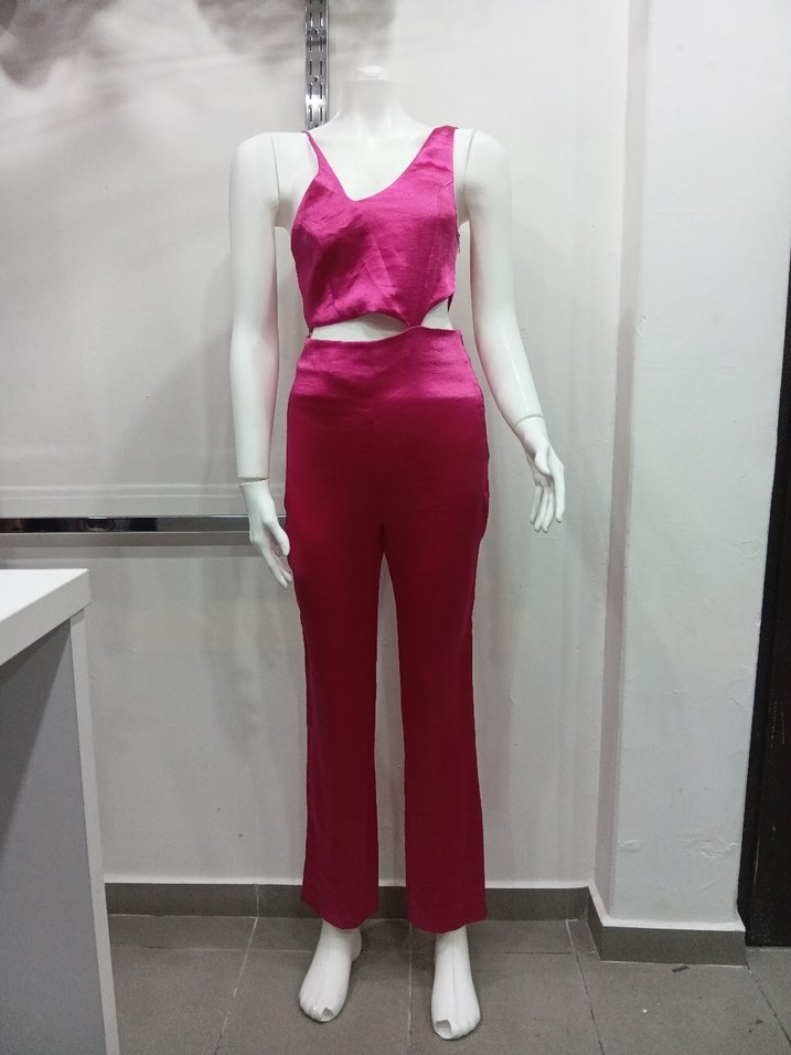 Parlak pembe renkli, V yakalı ve ince askılı uzun tulum. İpek dokulu kumaştan, regular fit ve zahmetsiz şıklık sunar. Parti için uygun. ✨
