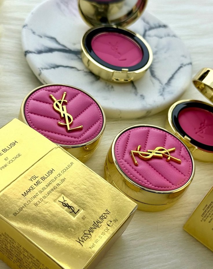 Yves Saint Laurent markalı, parlak pembe renkte, şık kapaklı ve altın detaylı allık. Üzerinde 'COULE' yazısı bulunur.