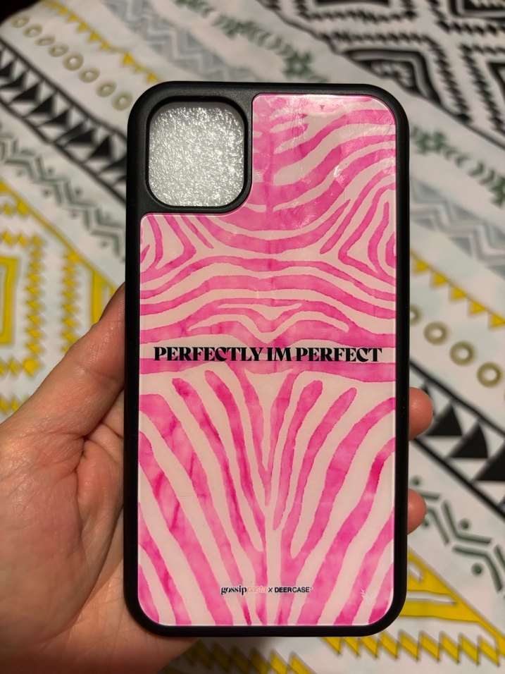 Parlak yüzeye sahip, pastel pembe zebra desenli telefon kılıfı. Üzerinde "PERFECTLY IMPERFECT" yazısı bulunur. Canlı ve karşı kültür tarzında. Apple 11