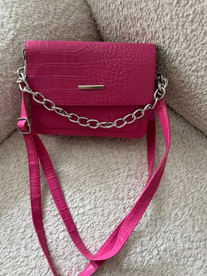 Parlak Pembe Zincir Detaylı Deri Çanta