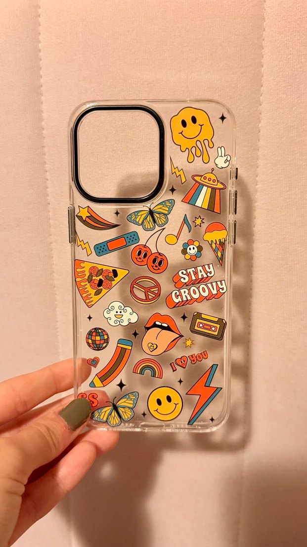 İphone 15 pro max Parlak yüzeye sahip, çok renkli pop kültür stickerlarıyla süslenmiş telefon kılıfı.