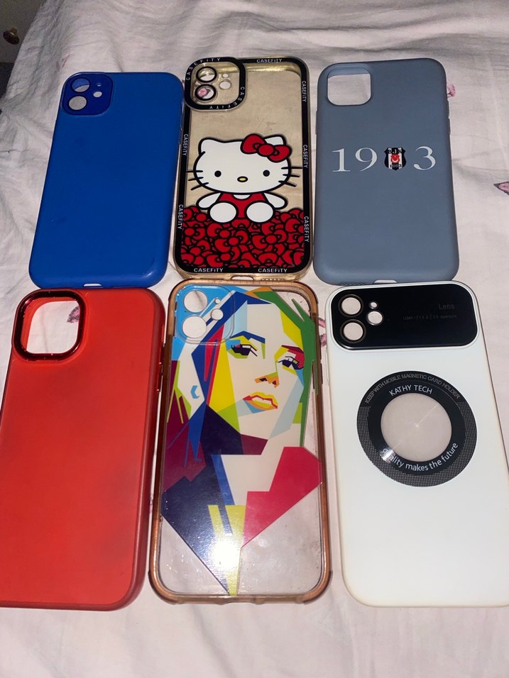 Parlak yüzeyli, pop kültür temalı çok renkli telefon kılıfları. Hello Kitty ve geometrik portre desenleri bulunur. Birinde 1903 sayısı var. İPhone 11 Tanesi 100 tl