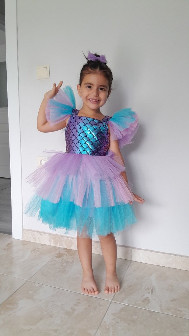 3 saat giyildi.tokası mevcut.Parlak pul detaylı, straplez ve vücuda oturan bu çocuk elbisesi, açık mor tie-dye desene sahiptir. Mavi ve mor katmanlı tül etek ve askılı kollara sahiptir. ✨
