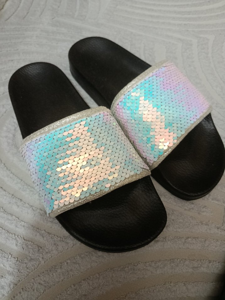 Parlak pul detaylı bant ve rahat kadın terlik, günlük kullanım için rahat bir tarz. Pulları ters döndüğünde gri pullu terlik oluyor iki renkli kullanılabilir. Deniz kızı terlik 38 numara temiz defosuz .