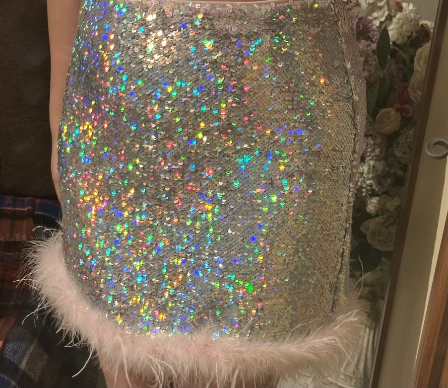 Kadınlar için parlak renkli pul payetlerle süslenmiş, sentetik kumaştan yapılmış, tüy detaylı ve dar kesim mini etek. Parti ve avant-garde tarz için uygundur. ✨ürün sıfır etiketlidir 38 M bedene uyar s bedene bol gelir