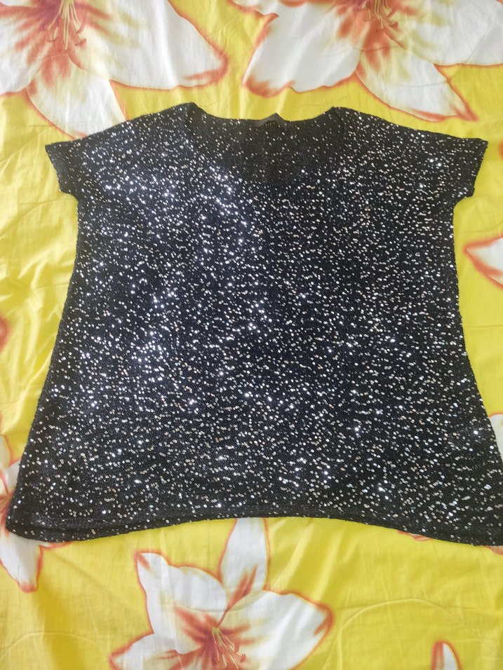 Kısa kollu, parlak pul detaylı ve renkli desenlidir. ölçüleri dikkate alınız ölçüleri resimlerde belirttim. ürün resimlerdeki gibidir ve kullanılmıştır. iade yoktur. yaka kısmındaki kusuru resimlerde belirtildi. dikilebilir. ✨