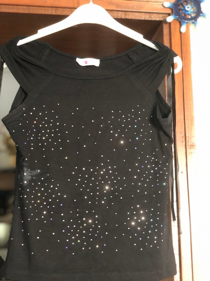 Siyah sentetik kumaştan, kolsuz ve parlak pul işlemeli, normal boyda, dar kesim siyah bluz✨ 1 kere anca giyilmiştir .