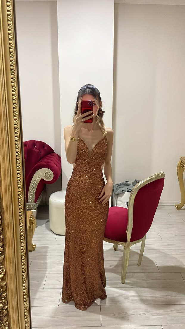 V yaka ve ince askılı, parlak pul payetli kahverengi uzun abiye, ışıltılı ve şık bir görünüm sunar. ✨