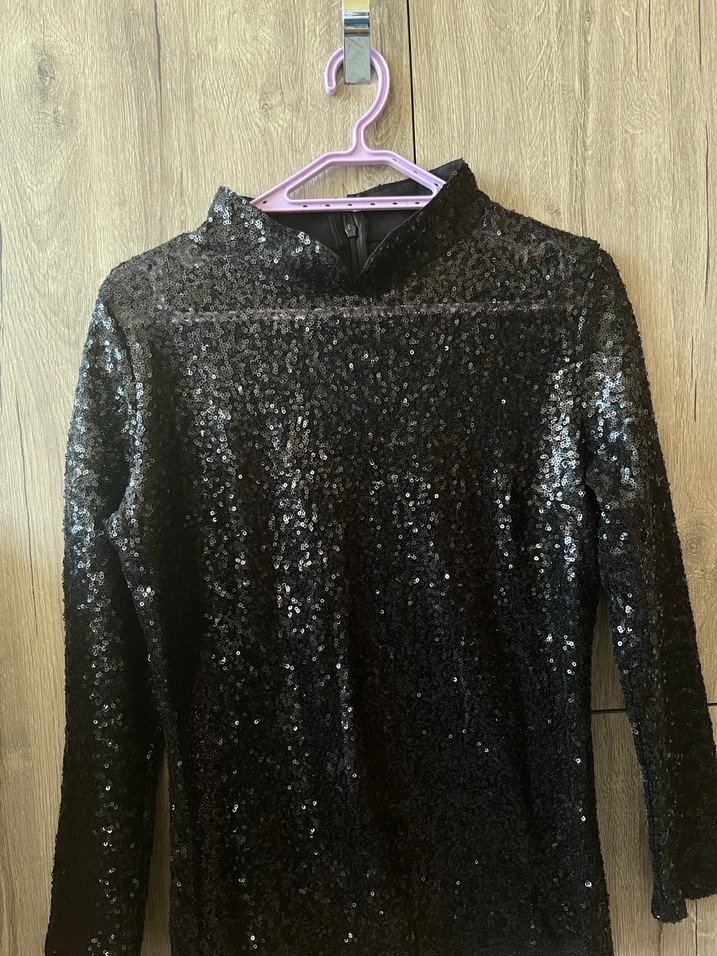 Parlak pullu Siyah Uzun Kollu Yüksek Yakalı Bluz