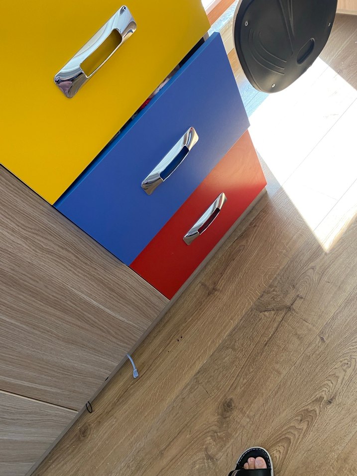 Sarı, mavi ve kırmızı renklerde, parlak yüzeye sahip üç çekmeceli çocuk dolabı, metal kulplu. Ranza çok kullanışlı, temiz kullanıldı, kızım büyüdüğü için satıyorum