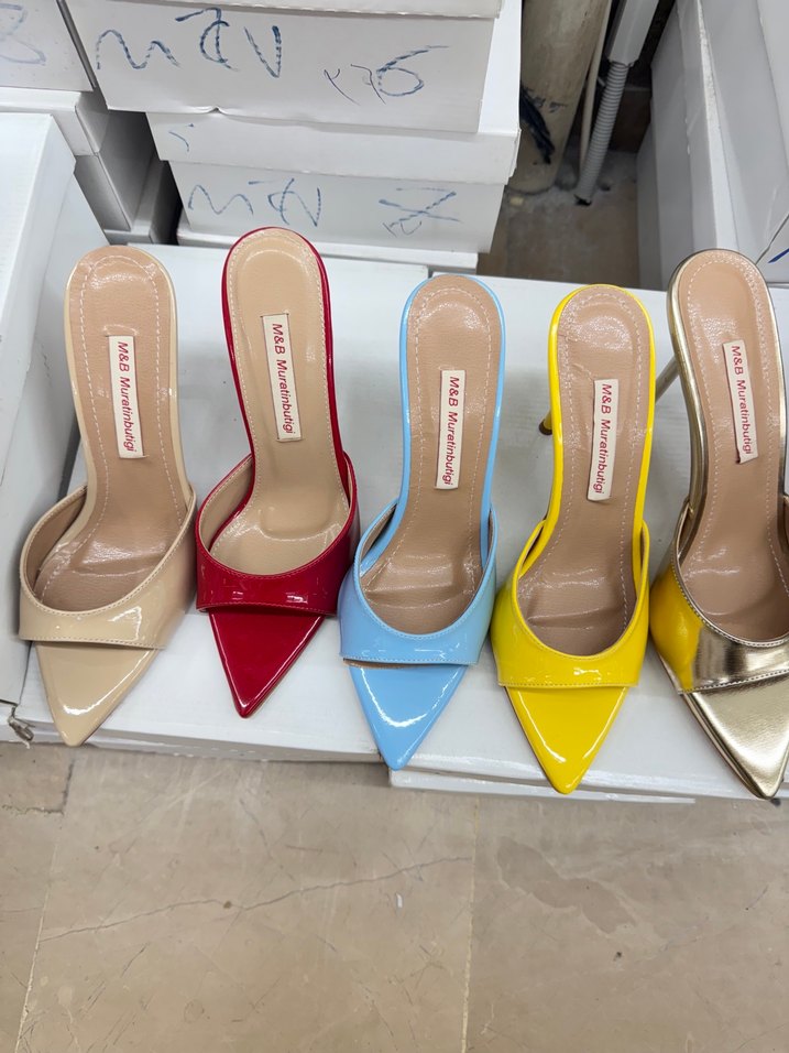 Kadınlar için parlak, çok renkli kauçuk malzemeden yapılmış stiletto topukludur. Keskin topuklu ve çağdaş minimalist tarzda, günlük kullanım için uygundur.