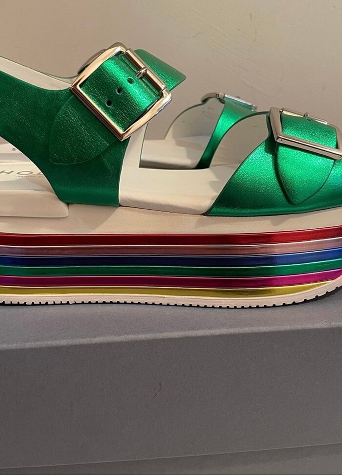 Parlak, çok renkli platform topuklu, tokalı ve desenli kadın sandaletleri, günlük kullanım için uygundur sadece bir kez kullanılmıştır