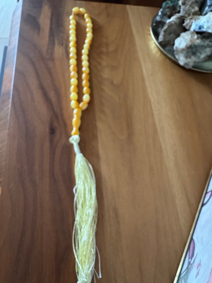 Parlak sarı renkte, uzun püsküllü bohem tarzı erkek tesbih.