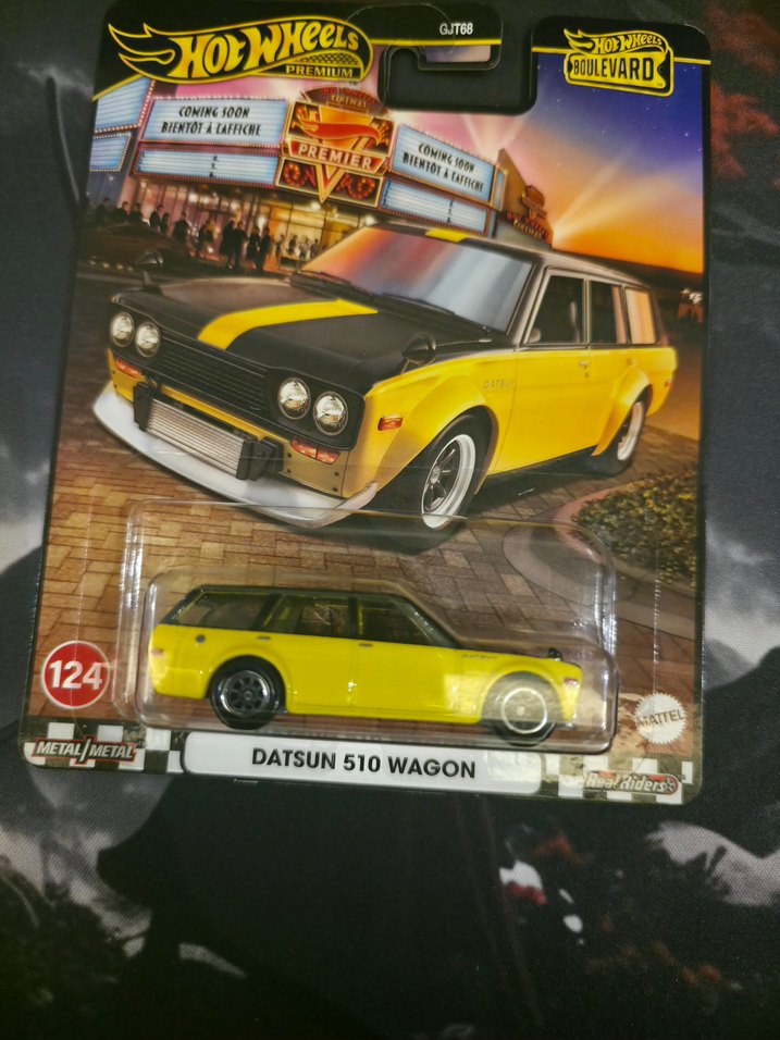 Parlak sarı renkte Datsun 510 Wagon oyuncak araba, metal detaylarla Hot Wheels Boulevard serisinden.