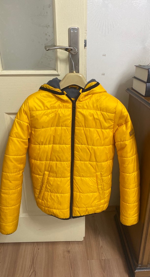 Fermuarlı, parlak sarı renkli ve kesimli erkek çocuk montu, yumuşak ve sıcak kumaştan günlük sokak stili için uygundur.