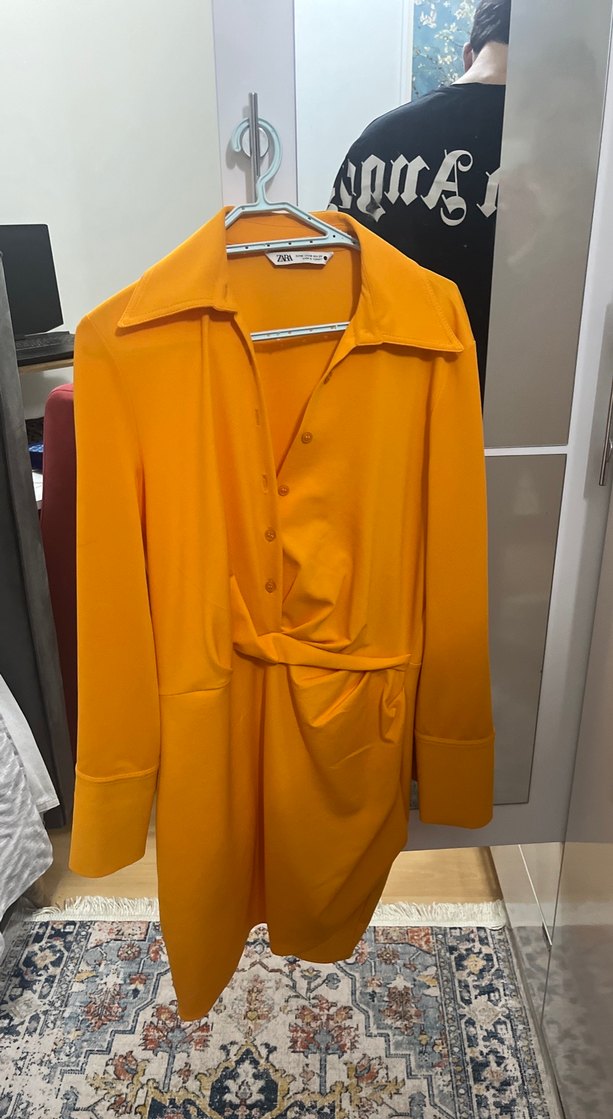 Parlak sarı renkte, düğmeli ve uzun kollu kadın midi ceketi. İpek gibi parlak kumaştan, iş ortamı için uygun, yakası kesik ve baskılı desenlidir.