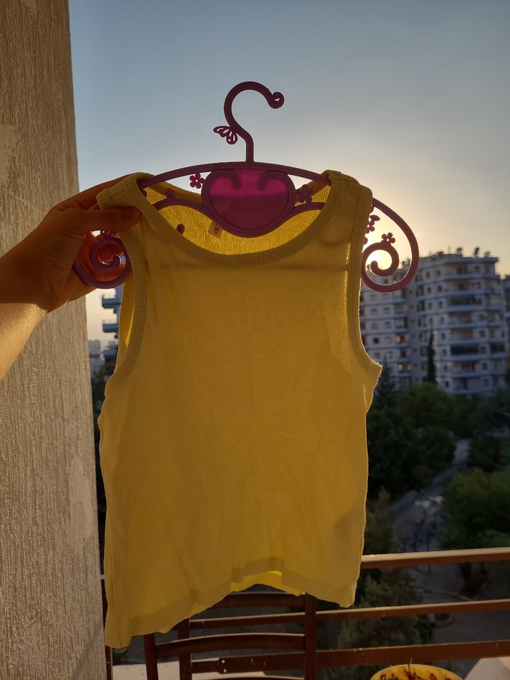 Parlak sarı renkte, desensiz ve kolsuz tasarıma sahip kız çocuk crop