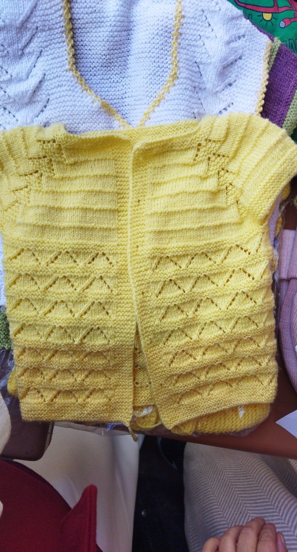 Parlak sarı renkte, kolsuz ve vücuda oturan kız çocuk örme hırka. Bohem tarzda, doku detaylı ve desensiz model.