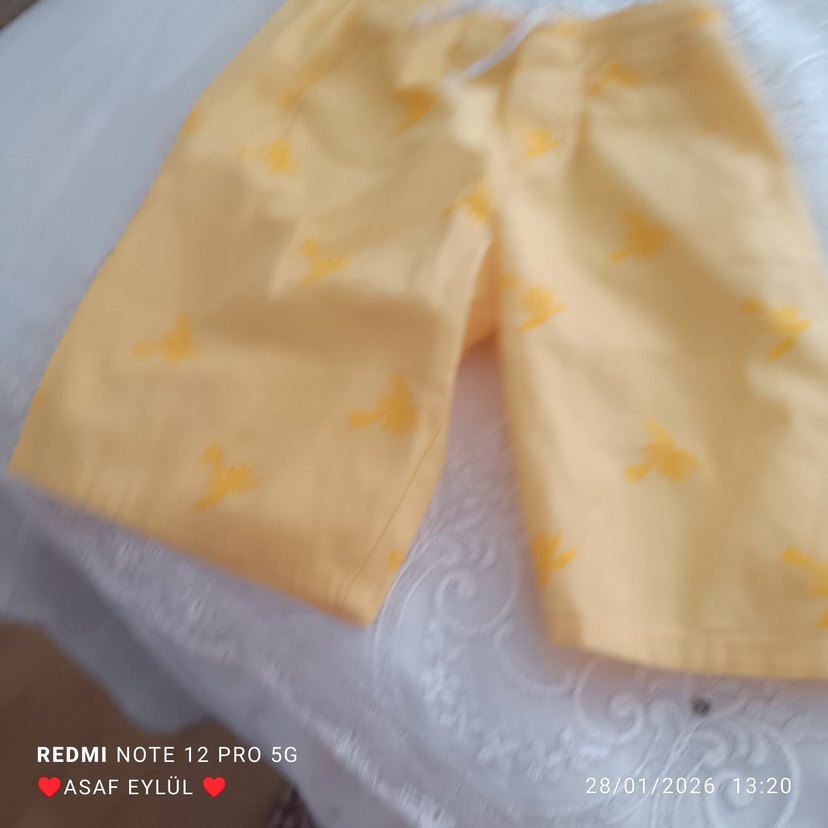 Parlak sarı renkte, desen içermeyen erkek kiz çocuk şortları, rahat kesimiyle dikkat çekiyor.