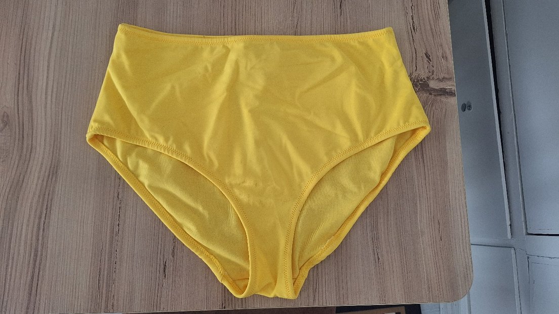 Parlak sarı renkte, bohem tarzda, midi boyda ve desensiz bikini altı. Athleisure tarzına uygun. Yüksek Bel Bikini Altı Hiç giyilmedi etiketi üstünde kusuru yok