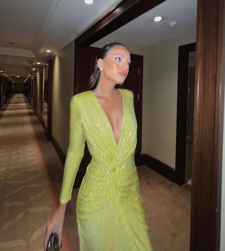 Derin V yakalı, pilili, parlak sarı kumaştan uzun ve vücuda oturan elbise, gösterişli parti tarzları için uygundur. ✨ Elbisenin bazı bölgelerinde taş eksilmesi var ama tercih edilebilir