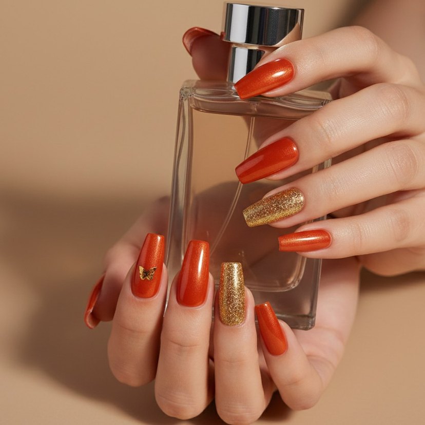 Göz alıcı parlaklık! Metalik kırmızı onlarında, üzerinde gold kelebek detayları bulunan bu set, özellikle gece etkinlikleri ve özel günler için mükemmel. Çok canlı ve dikkat çekici. Hashtagler: #turuncutirnak #kelebeklitirnak #metaliktirnak #partistili #takmatirnak #naildesign Parlak tırnak süsleri, kelebek detayları ile canlı bir görünüm sağlar. ✨