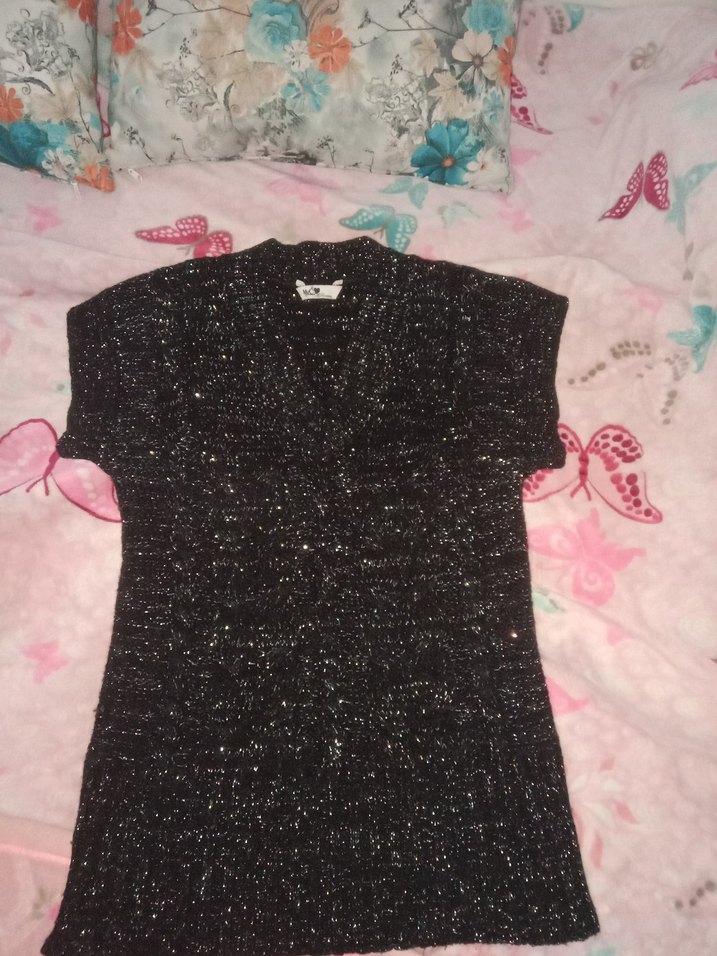 Simli detaylı, kısa kollu, V yaka, uzun kesim ve dar kesim siyah kadın kazak. Yumuşak sentetik kumaştan, günlük sokak stiline uygun rahat bir parça. ✨