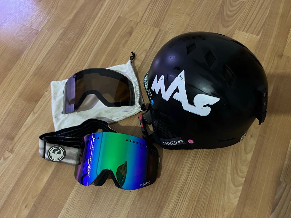 Parlak siyah, baskılı desenli ve cam lensli erkek kayak gözlüğü. Ve kaskı ufak tefek çizikler dışında bi sorunu yok 1 gözlük yedek sis lensi ve kask kulak koruması ayrı satış için yardımcı olabilirim