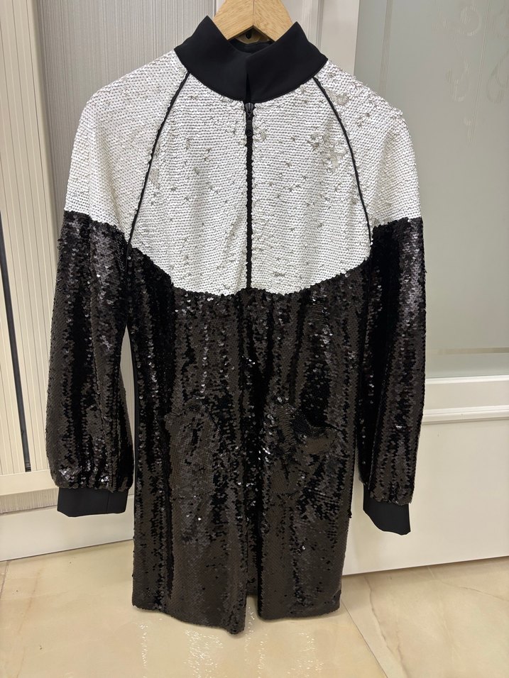 Bu vücuda oturan abiye elbise, yüksek yakalı ve uzun kolludur, parlak siyah ve beyaz payetlerle kaplıdır. Parti için avant-garde sokak tarzı sunar. ✨