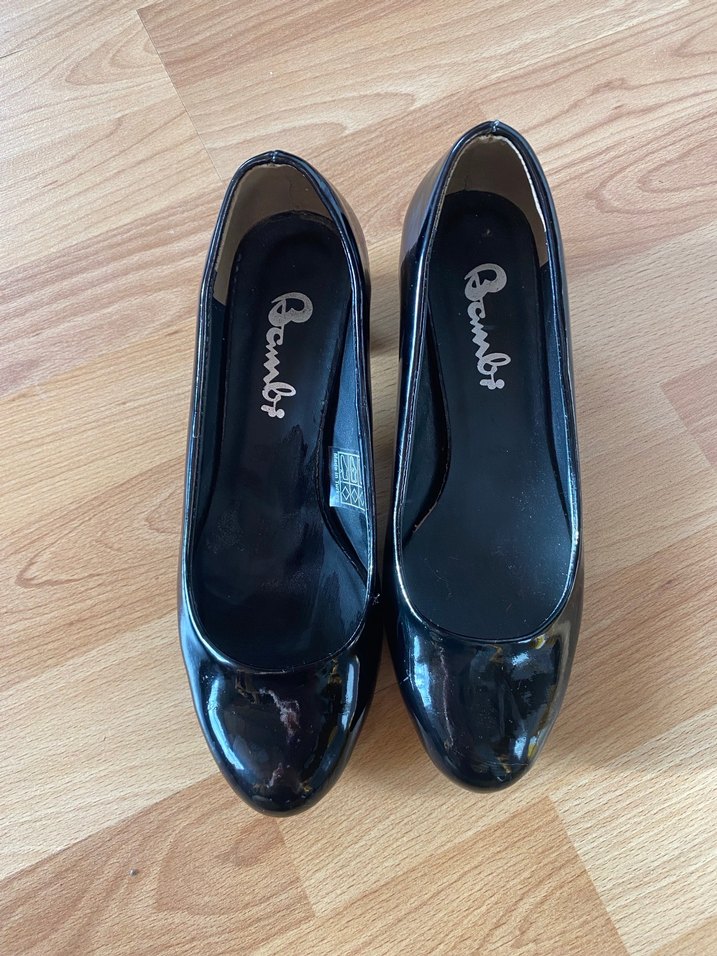 Bombi markalı, parlak siyah renkte, blok topuklu kadın klasik ayakkabılar. Cesur gotik tarzıyla ofis kullanımına uygundur.