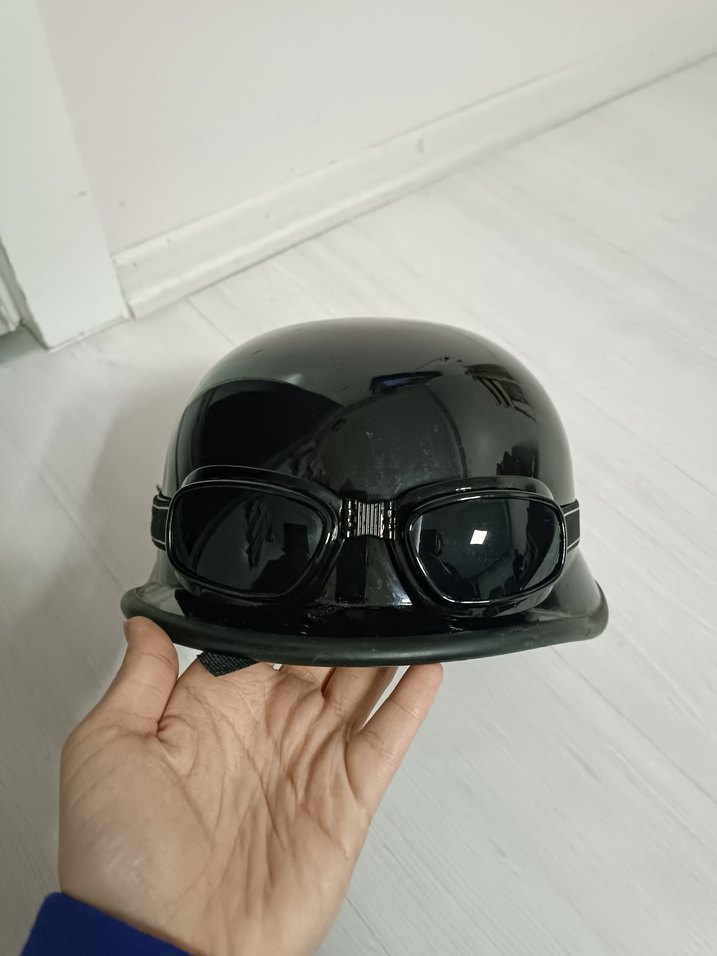 Cam malzemeden yapılmış, parlak siyah motosiklet kaskı. Biker tarzı ve grunge punk havası taşıyan, koyu ve desensiz tasarıma sahip, gözlük detaylı rock punk görünümü. ️sıfır motor kaskı.