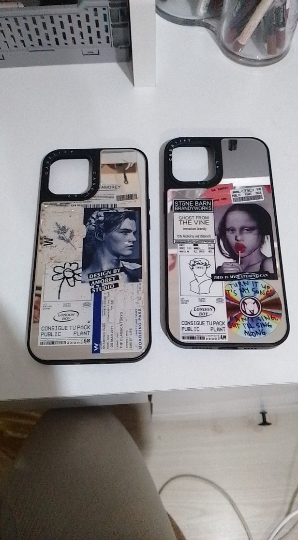 Parlak yüzeyli siyah telefon kılıfları, kolaj tasarımlar ve çeşitli yazı öğeleriyle counterculture tarzını yansıtıyor.