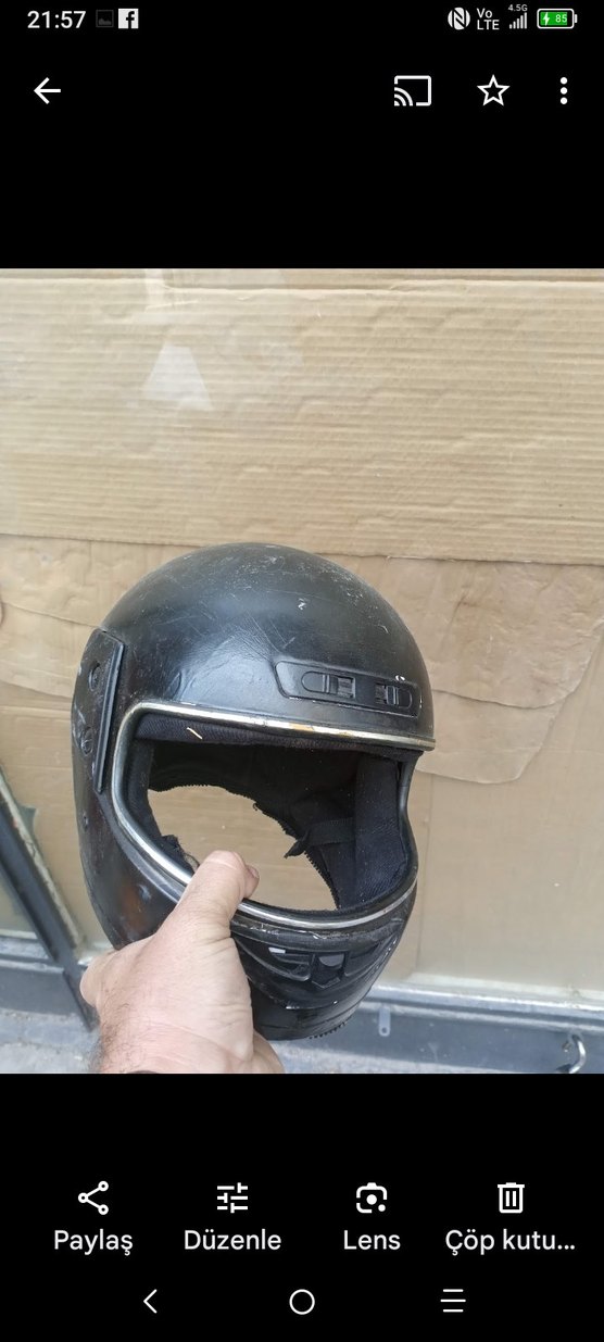 Parlak siyah deri malzemeden yapılmış, tokalı bağlamalı, desen içermeyen grunge punk tarzı biker motosiklet kaskı. Rock punk havası verir. ️
