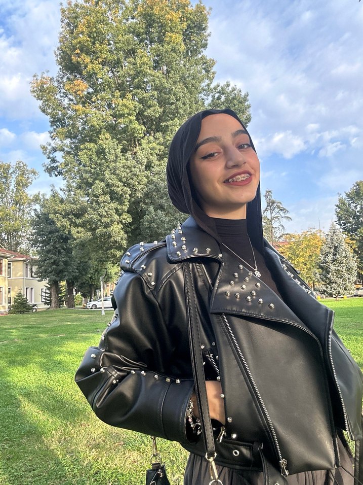 Parlak siyah deri, yakalı ve uzun kollu bu dar kesim goth ceket, etnik tarzda çivili detaylara sahip.
