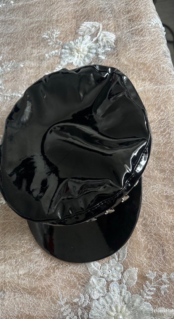 Parlak siyah deri gotik tarzda kadın şapka, modaya uygun ve avangart görünüm sağlar.