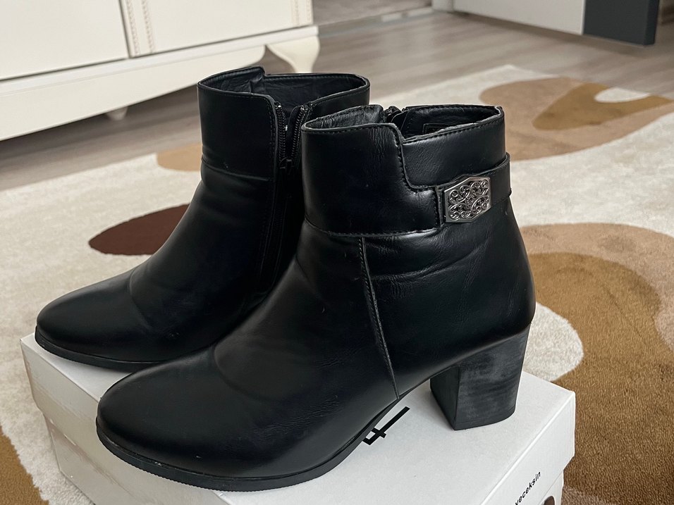 Parlak siyah deri, kalın topuklu ve tokalı detaylı kadın botlarıdır. İnce yılan deseniyle gotik tarzda, günlük kullanıma uygundur. Birkaç kere kullanıldı.