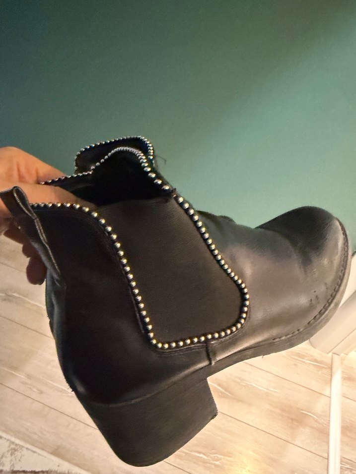 Parlak siyah deri kadın botu, blok topuklu ve tokalı detaylıdır. Gotik tarzda, Parisli rock punk havası taşır.