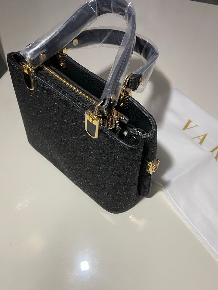 Parlak Vakko logolu siyah deri kadın çantası, tokalı detaylarla klasik ve modern tarzı bir araya getiriyor.Gümrük ürünü