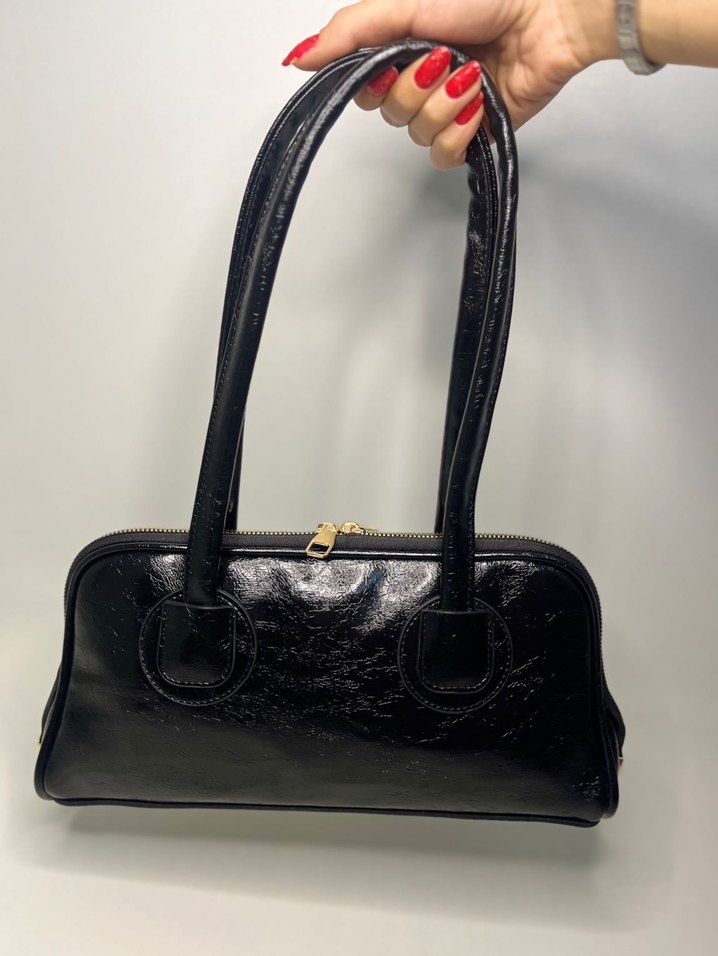 Parlak siyah deri, tokalı ve uzun saplı kadın çantasıdır. Klasik zarafet ile gotik tarzı bir araya getirir. Günlük kullanıma uygundur.