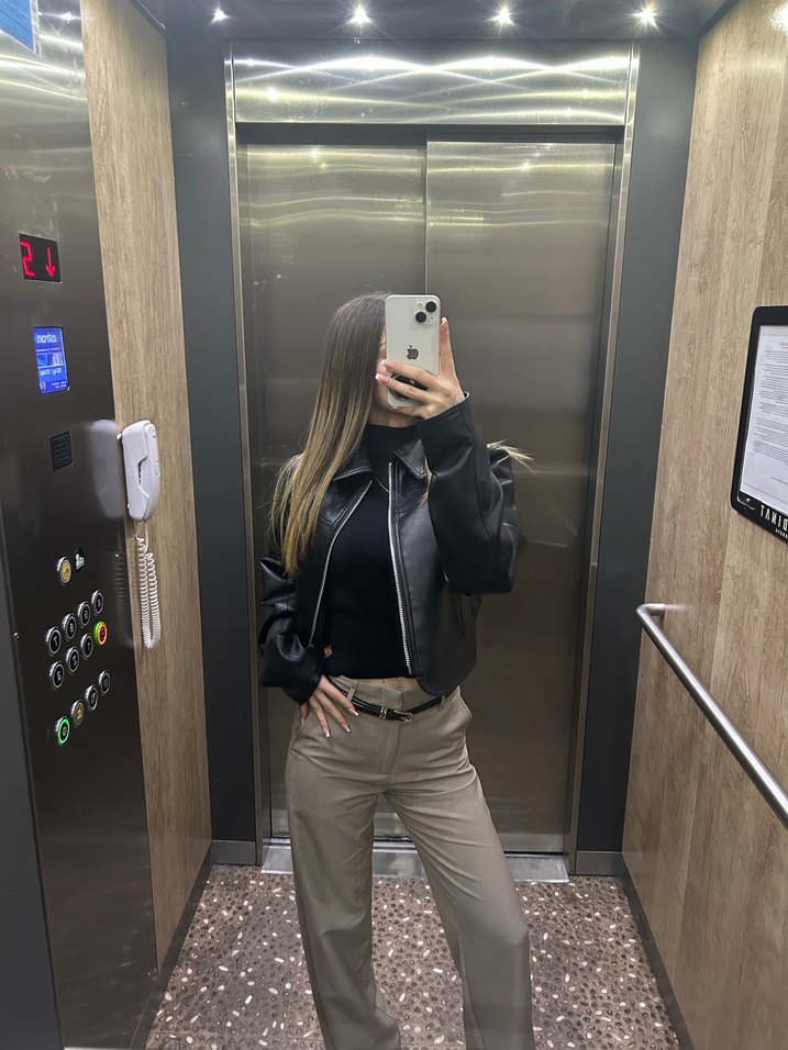 Parlak siyah deri ceket, yüksek yakalı, uzun kollu ve vücuda oturan kesime sahiptir. Normal midi boyda, desen içermeyen günlük kullanım için uygundur.