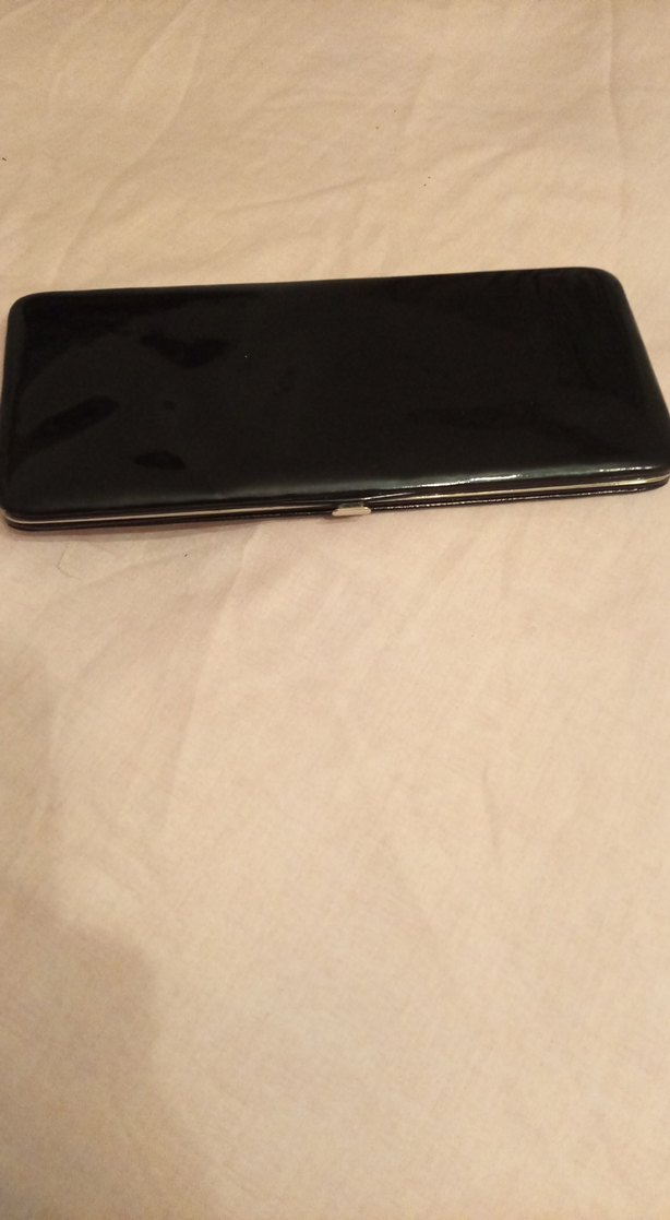 Parlak deri kaplamalı, desen içermeyen siyah kadın cüzdan, günlük kullanım için uygundur.