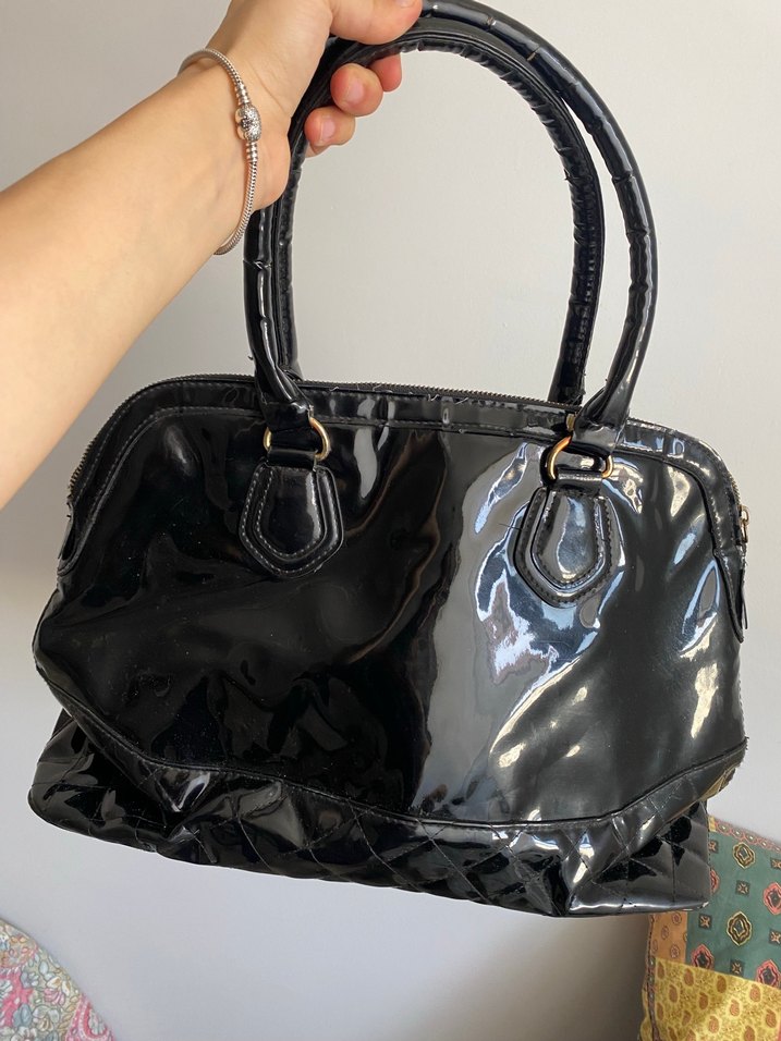Parlak siyah deri, desen içermeyen, yuvarlak saplı kadın omuz çantası, günlük kullanım için uygundur. Birkaç defa kullanıldı durumu iyi