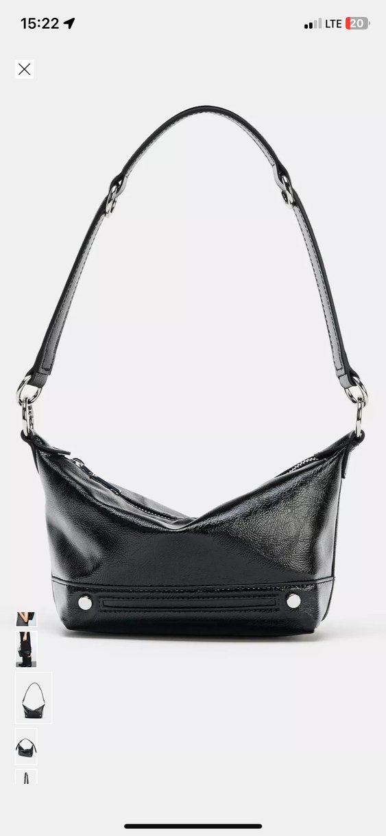 Parlak siyah deri omuz çantası, tokalı kayış ve minimalist tasarıma sahip, günlük kullanıma uygundur.