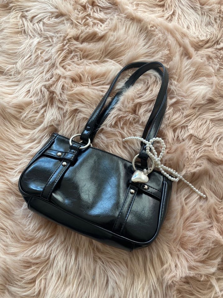 Parlak siyah deri, tokalı kadın omuz çantası. Günlük kullanıma uygun, trend goth tarzında. İnci aksesuar detaylı.