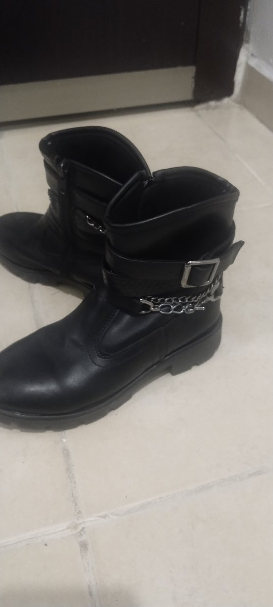Parlak deri ve yılan desenli siyah botlar, kemerli ve zincir detaylıdır. Blok topuklu ve rock punk havasındadır.