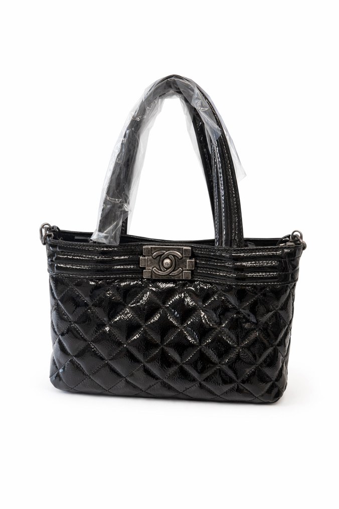 Parlak siyah deri, kareli desene sahip, tokalı kapama detaylı, modern klasik tarzda Paris esintili günlük kadın çantası. Sabit omuza asmak için zincir askısı mevcuttur