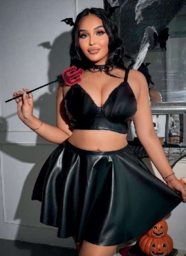 Parlak siyah deri, straplez yakalı ve askılı kollu, kısa ve vücuda oturan bustiyer, gotik parti stili için ideal.