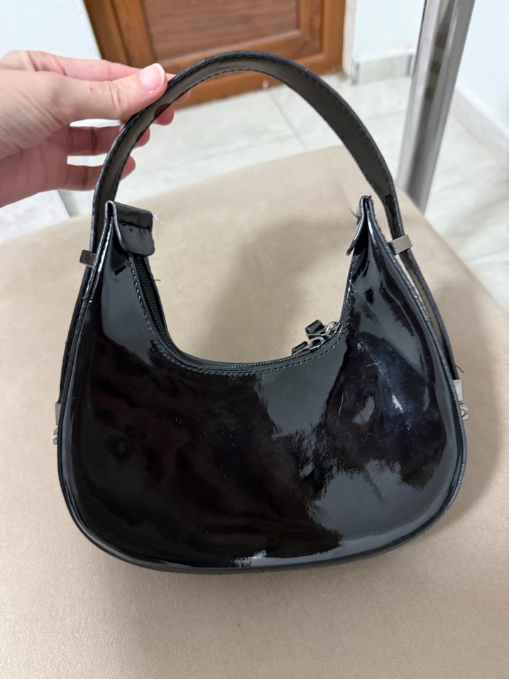 Parlak siyah deri tokalı, desen içermeyen kadın çantası. Paris tarzı gotik dokunuşuyla günlük kullanıma uygun.